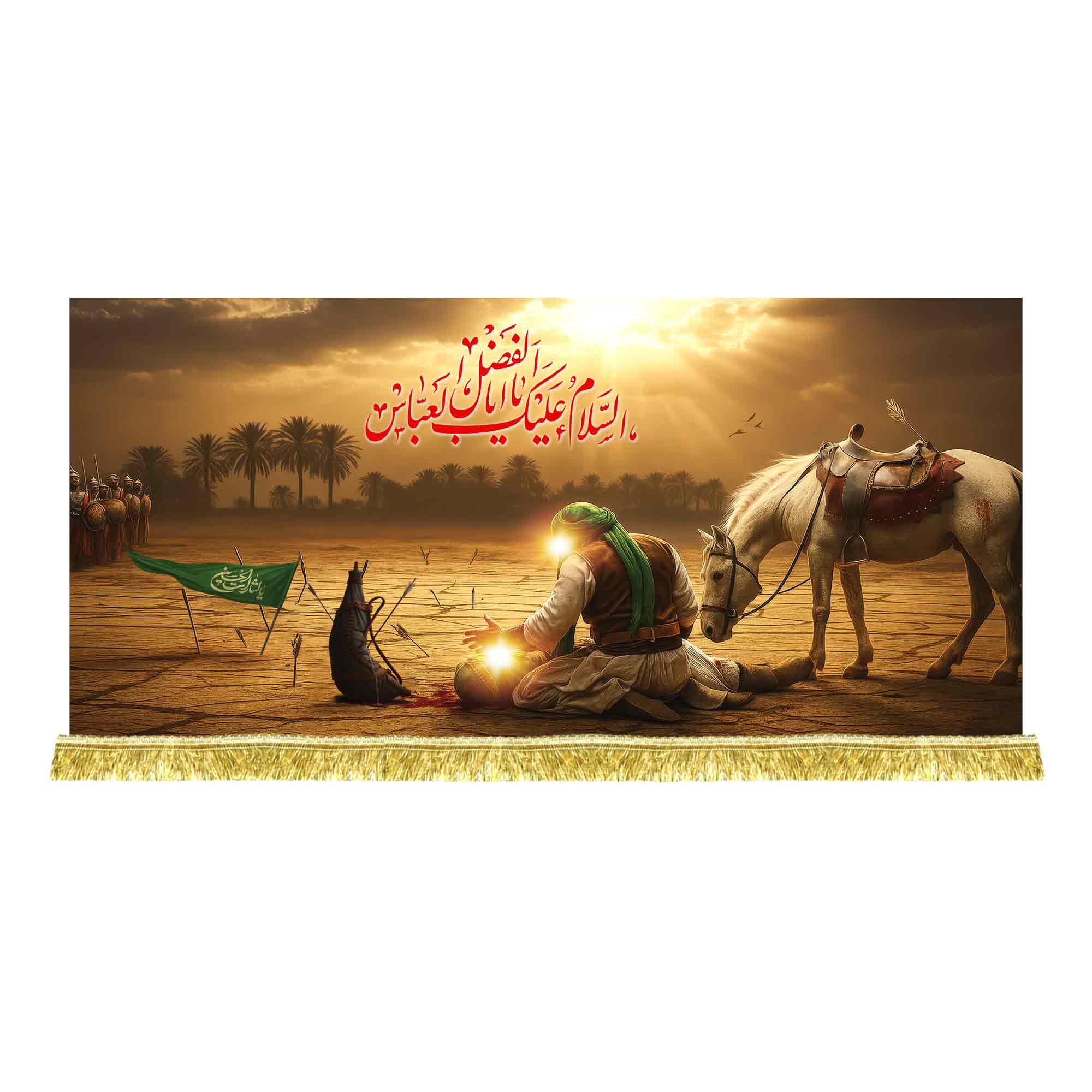 کتیبه ( دکور ) مخمل شهادت حضرت ابوالفضل (ع) و رسیدن امام حسین (ع) بالای سر برادر به همراه ذکر السلام علیک یا اباالفضل العباس (ع) که با طراحی جدید در ابعاد مختلف قابل سفارش است. استفاده شده از پارچه مخمل درجه یک قابل شستشو و با بهترین کیفیت چاپ که همراه با دور دوزی ، ریشه دوزی و بندینک آویز می باشد و در مجموعه انتشارات مشهور به تولید رسیده است.