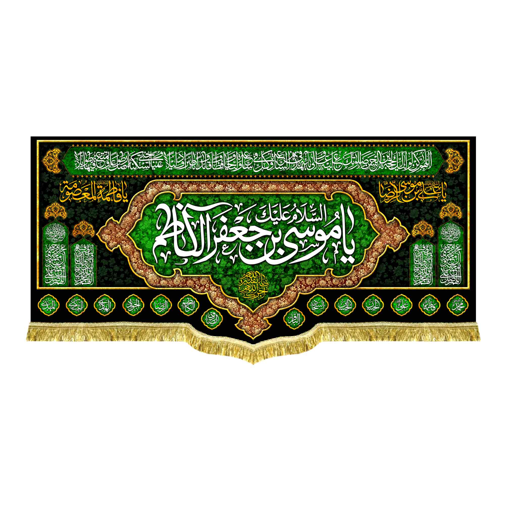 دکور ( کتیبه ) مخمل شهادت امام موسی کاظم (ع) با ذکر السلام علیک یا موسی بن جعفر الکاظم (ع) به همراه اسامی مبارک چهارده معصوم (ع) ، دعای سلامتی امام زمان (عج) ، اللهم عجل لولیک الفرج ، صلوات که با طراحی جدید در ابعاد مختلف قابل سفارش است. استفاده شده از پارچه مخمل درجه یک قابل شستشو و با بهترین کیفیت چاپ که همراه با دور دوزی ، ریشه دوزی و بندینک آویز می باشد. این محصول از طراحی تا چاپ به طور کامل در انتشارات مشهور به تولید رسیده است.