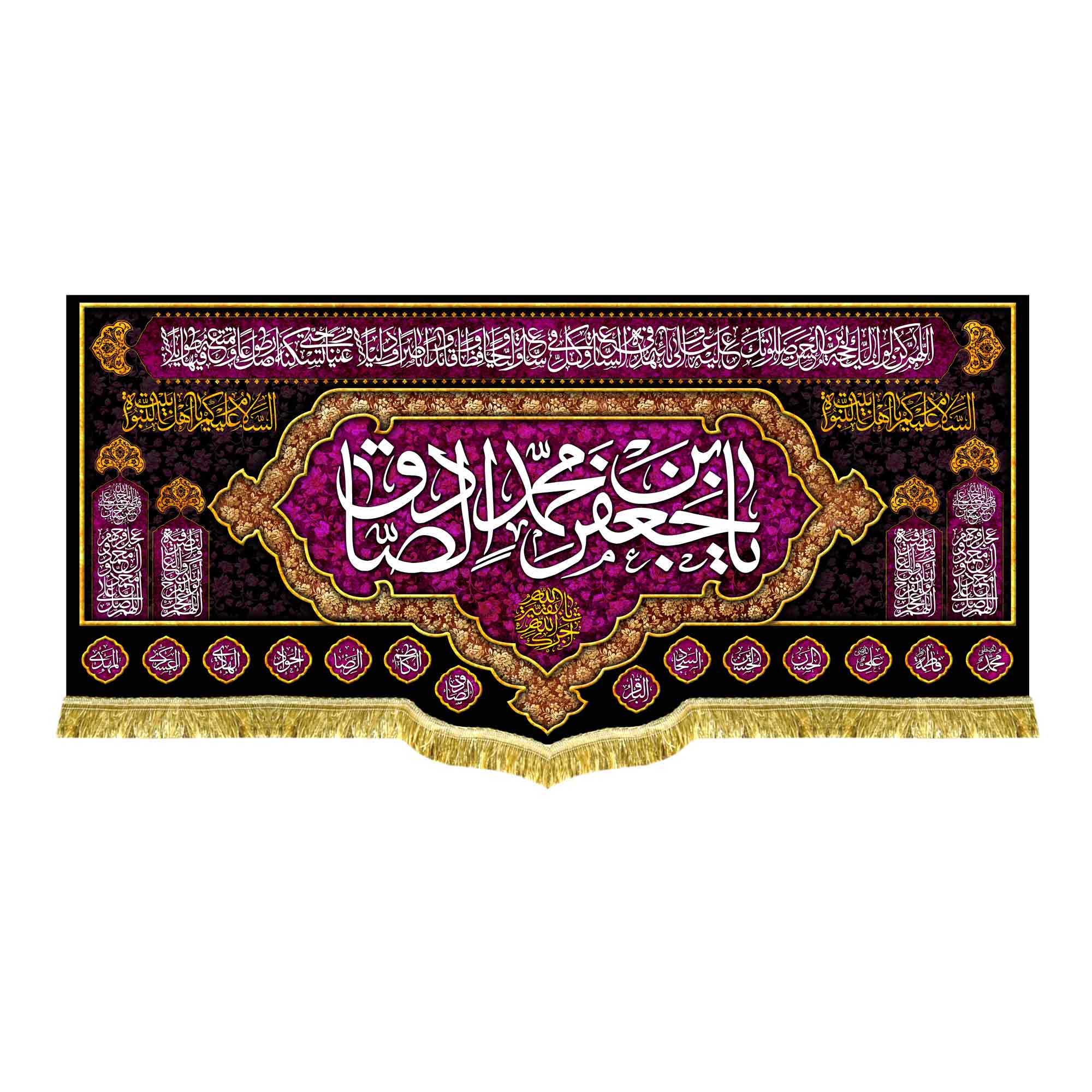 دکور ( کتیبه ) مخمل شهادت امام جعفر صادق (ع) با ذکر یا جعفر بن محمد الصادق (ع) به همراه اسامی مبارک چهارده معصوم (ع) ، دعای سلامتی امام زمان (عج) ، اللهم عجل لولیک الفرج ، صلوات که با طراحی جدید در ابعاد مختلف قابل سفارش است. استفاده شده از پارچه مخمل درجه یک قابل شستشو و با بهترین کیفیت چاپ که همراه با دور دوزی ، ریشه دوزی و بندینک آویز می باشد. این محصول از طراحی تا چاپ به طور کامل در انتشارات مشهور به تولید رسیده است.