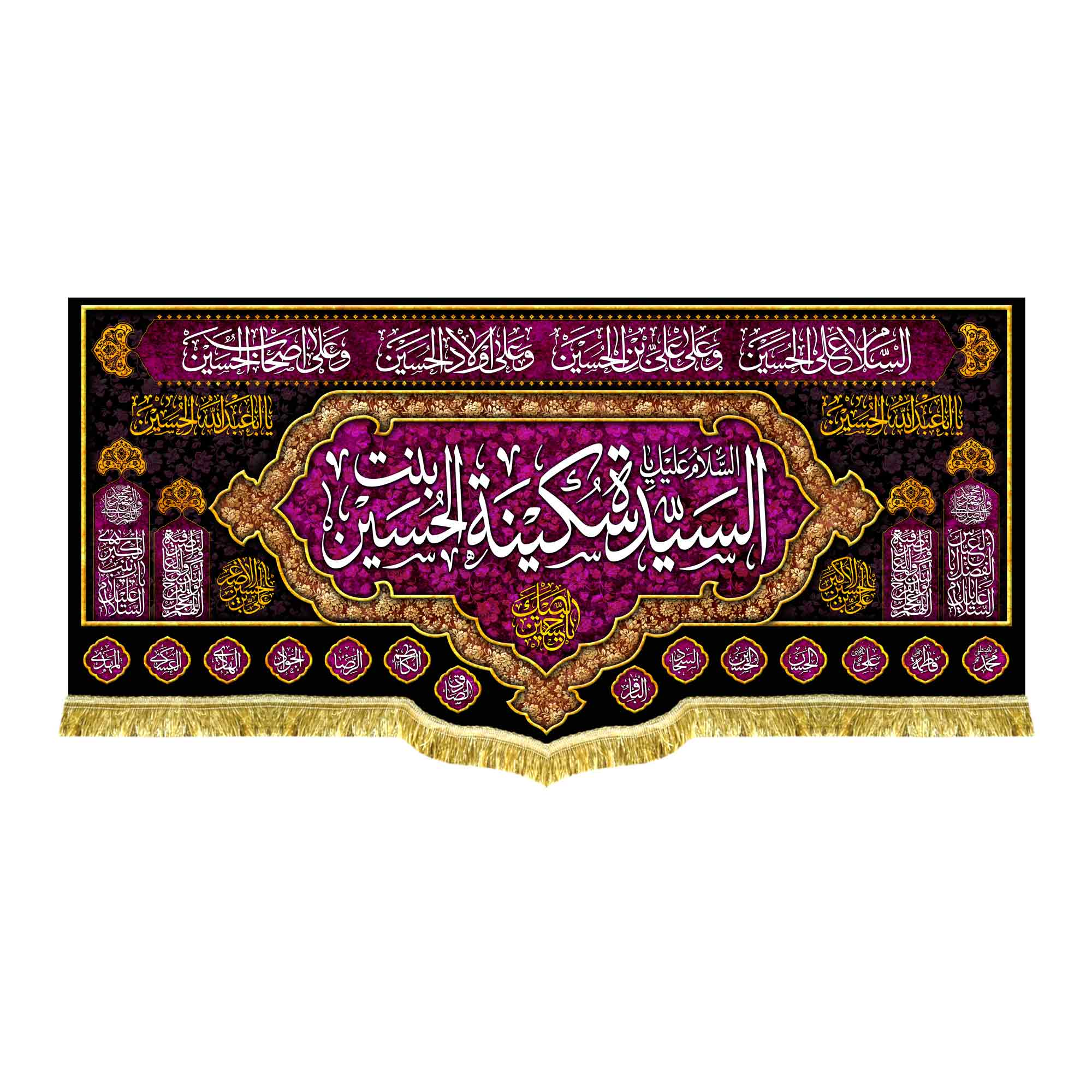 کتیبه ( دکور ) مخمل سیده سکینه (س) با ذکر السلام علیک یا سیده سکینه بنت الحسین (ع) به همراه اسامی مبارک چهارده معصوم (ع) ، چهار سلام زیارت عاشورا ، یا اباعبدالله الحسین (ع) ، اللهم عجل لولیک الفرج ، صلوات که با طراحی جدید در ابعاد مختلف قابل سفارش است. استفاده شده از پارچه مخمل درجه یک قابل شستشو و با بهترین کیفیت چاپ که همراه با دور دوزی ، ریشه دوزی و بندینک آویز می باشد. این محصول از طراحی تا چاپ به طور کامل در انتشارات مشهور به تولید رسیده است.