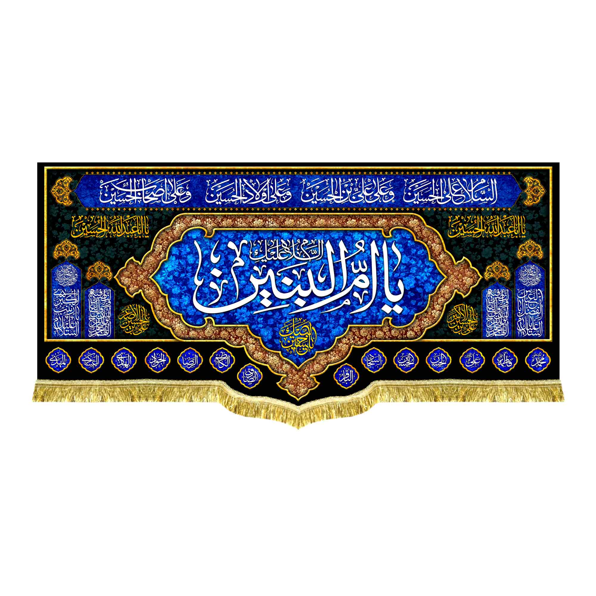 کتیبه ( دکور ) مخمل حضرت ام البنین (س) با ذکر السلام علیک یا ام البنین (س) به همراه اسامی مبارک چهارده معصوم (ع) ، چهار سلام زیارت عاشورا ، یا اباعبدالله الحسین (ع) ، اللهم عجل لولیک الفرج ، صلوات که با طراحی جدید در ابعاد مختلف قابل سفارش است. استفاده شده از پارچه مخمل درجه یک قابل شستشو و با بهترین کیفیت چاپ که همراه با دور دوزی ، ریشه دوزی و بندینک آویز می باشد. این محصول از طراحی تا چاپ به طور کامل در انتشارات مشهور به تولید رسیده است.