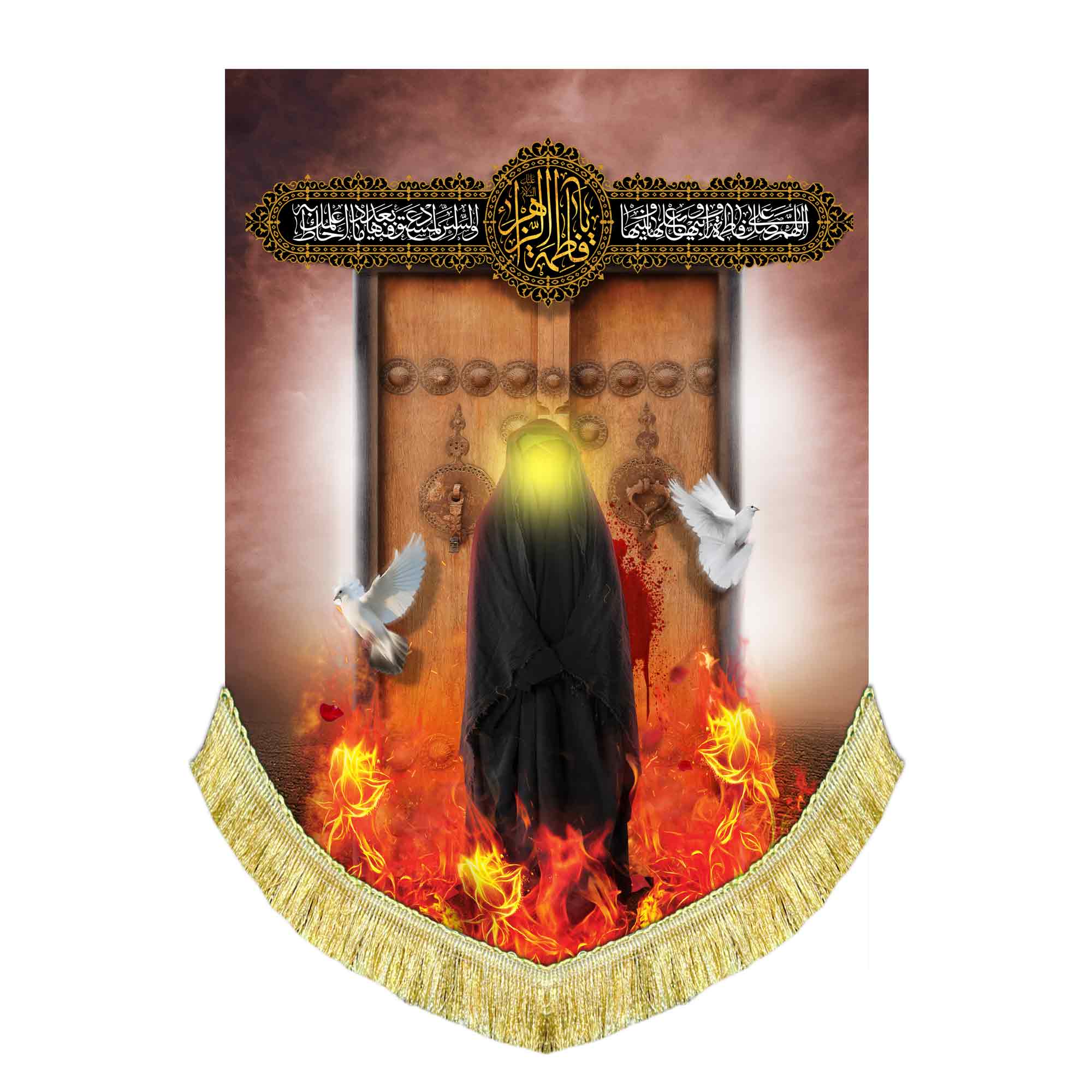 کتیبه ( دکور ) عمودی مخمل درب سوخته خانه حضرت زهرا (س) فاطمیه شهادت حضرت فاطمه زهرا (س) به همراه ذکر السلام علیک یا فاطمه الزهرا (س) ، صلوات حضرت زهرا (س) که با طراحی جدید در ابعاد مختلف قابل سفارش است. استفاده شده از پارچه مخمل درجه یک قابل شستشو و با بهترین کیفیت چاپ که همراه با دور دوزی ، ریشه دوزی و بندینک آویز می باشد و در مجموعه انتشارات مشهور به تولید رسیده است.