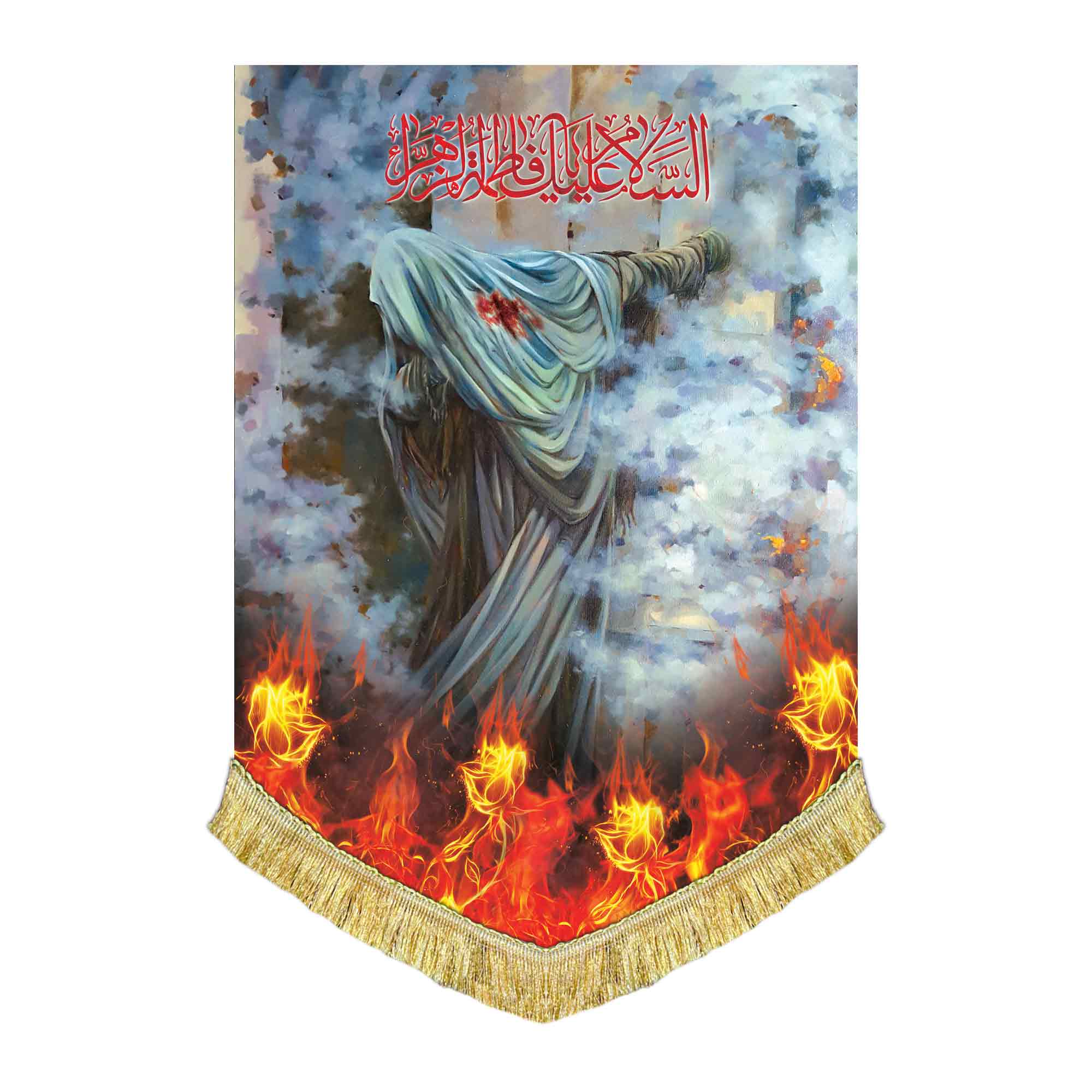 کتیبه ( دکور ) مخمل عمودی فاطمیه شهادت حضرت فاطمه زهرا (س) نقاشی ضربت خوردن حضرت فاطمه زهرا (س) در پشت درب توسط اهل سقیفه به همراه ذکر السلام علیک یا فاطمه الزهرا (س) که با طراحی جدید در ابعاد مختلف قابل سفارش است. استفاده شده از پارچه مخمل درجه یک قابل شستشو و با بهترین کیفیت چاپ که همراه با دور دوزی ، ریشه دوزی و بندینک آویز می باشد و در مجموعه انتشارات مشهور به تولید رسیده است.