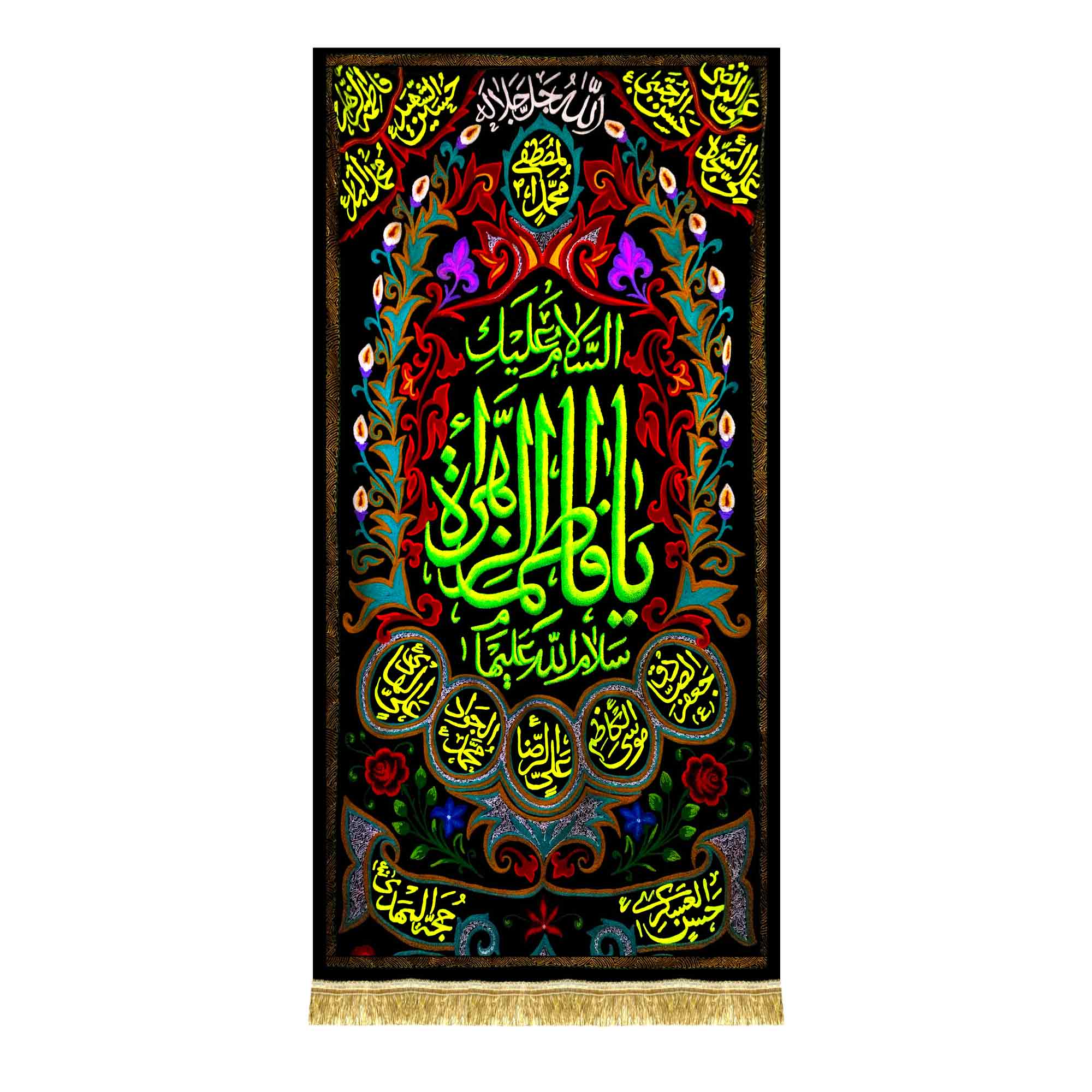 کتیبه ( دکور ) عمودی مخمل فاطمیه شهادت حضرت فاطمه زهرا (س) با ذکر السلام علیک یا فاطمه الزهرا (س) به همراه اسامی چهارده معصوم (ع) که با طراحی جدید سبک گلدوزی در ابعاد مختلف قابل سفارش است. استفاده شده از پارچه مخمل درجه یک قابل شستشو و با بهترین کیفیت چاپ که همراه با دور دوزی ، ریشه دوزی و بندینک آویز می باشد و در مجموعه انتشارات مشهور به تولید رسیده است.