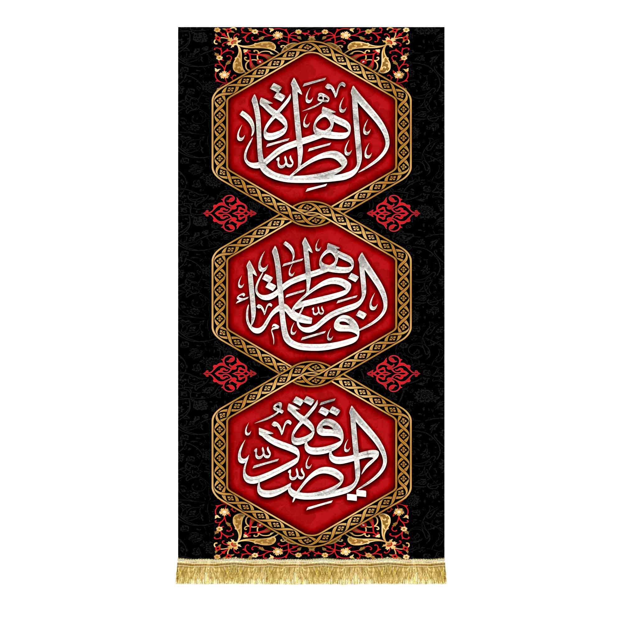 کتیبه ( دکور ) عمودی مخمل فاطمیه شهادت حضرت فاطمه زهرا (س) که با طراحی جدید در ابعاد مختلف قابل سفارش است. استفاده شده از پارچه مخمل درجه یک قابل شستشو و با بهترین کیفیت چاپ که همراه با دور دوزی ، ریشه دوزی و بندینک آویز می باشد و در مجموعه انتشارات مشهور به تولید رسیده است.