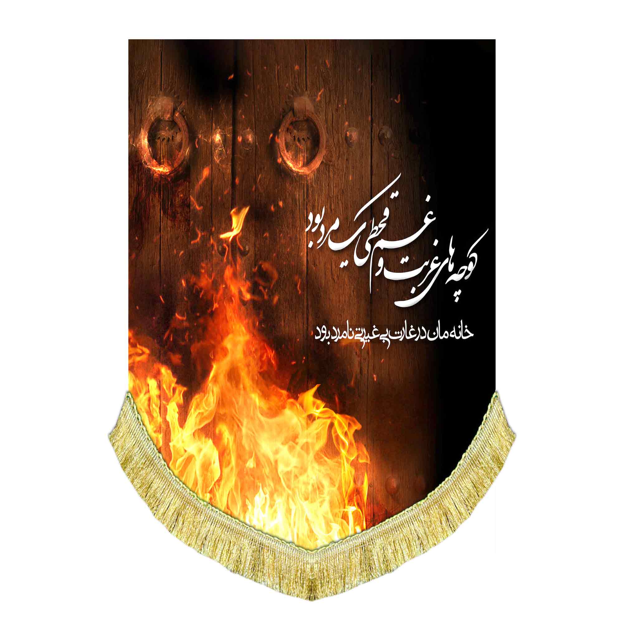 کتیبه ( دکور ) عمودی مخمل فاطمیه شهادت حضرت فاطمه زهرا (س) با شعر کوچه های غربت و غم قحطی یک مرد بود خانه مان در غارت بی غیرتی نامرد بود که با طراحی جدید درب سوخته خانه حضرت زهرا (س) که با طراحی جدید در ابعاد مختلف قابل سفارش است. استفاده شده از پارچه مخمل درجه یک قابل شستشو و با بهترین کیفیت چاپ که همراه با دور دوزی ، ریشه دوزی و بندینک آویز می باشد و در مجموعه انتشارات مشهور به تولید رسیده است.